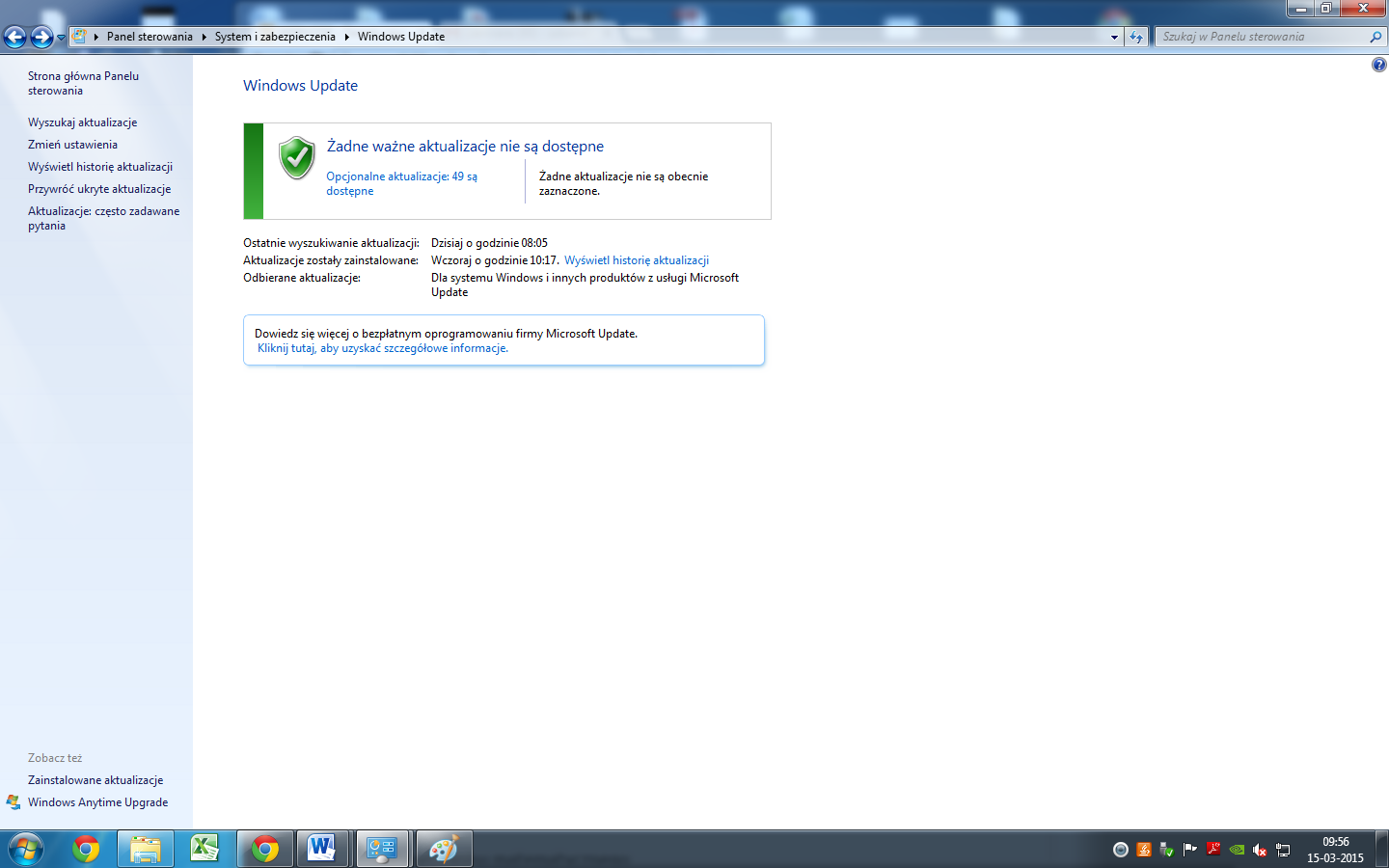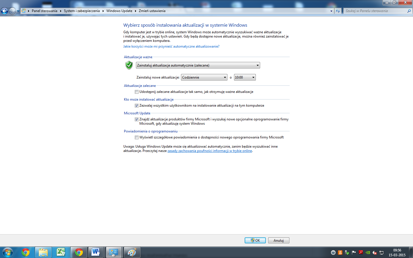 Aby sprawdzić dostępnośc aktualizacji otwieramy Panel sterowania/System i zabezpieczenia/windows update/ Zmień ustawienia/ aktualizacje ważne/Wybieramy sposób i czas instalowania aktualizacji.